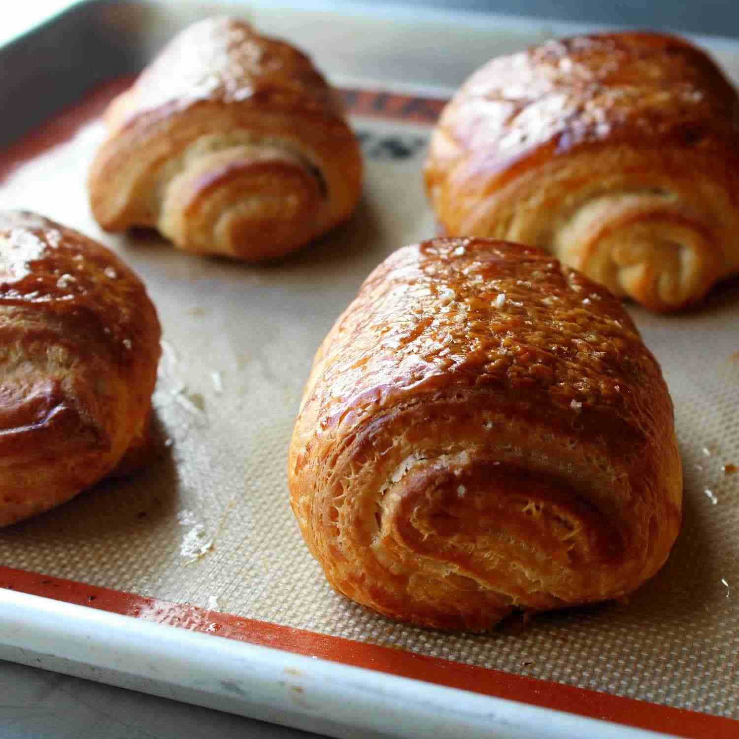 - Step 11:Pull and stretch out 1 of the dough pieces until ends are slightly tapered. Line 1 to 2 tablespoon of chocolate 1 inch parallel to the bottom edge and an equal amount of chocolate 1 more inch ahead. Roll dough up over the chocolate toward the top short edge to form a croissant with the seam at the bottom. Repeat with the remaining 5 dough pieces.